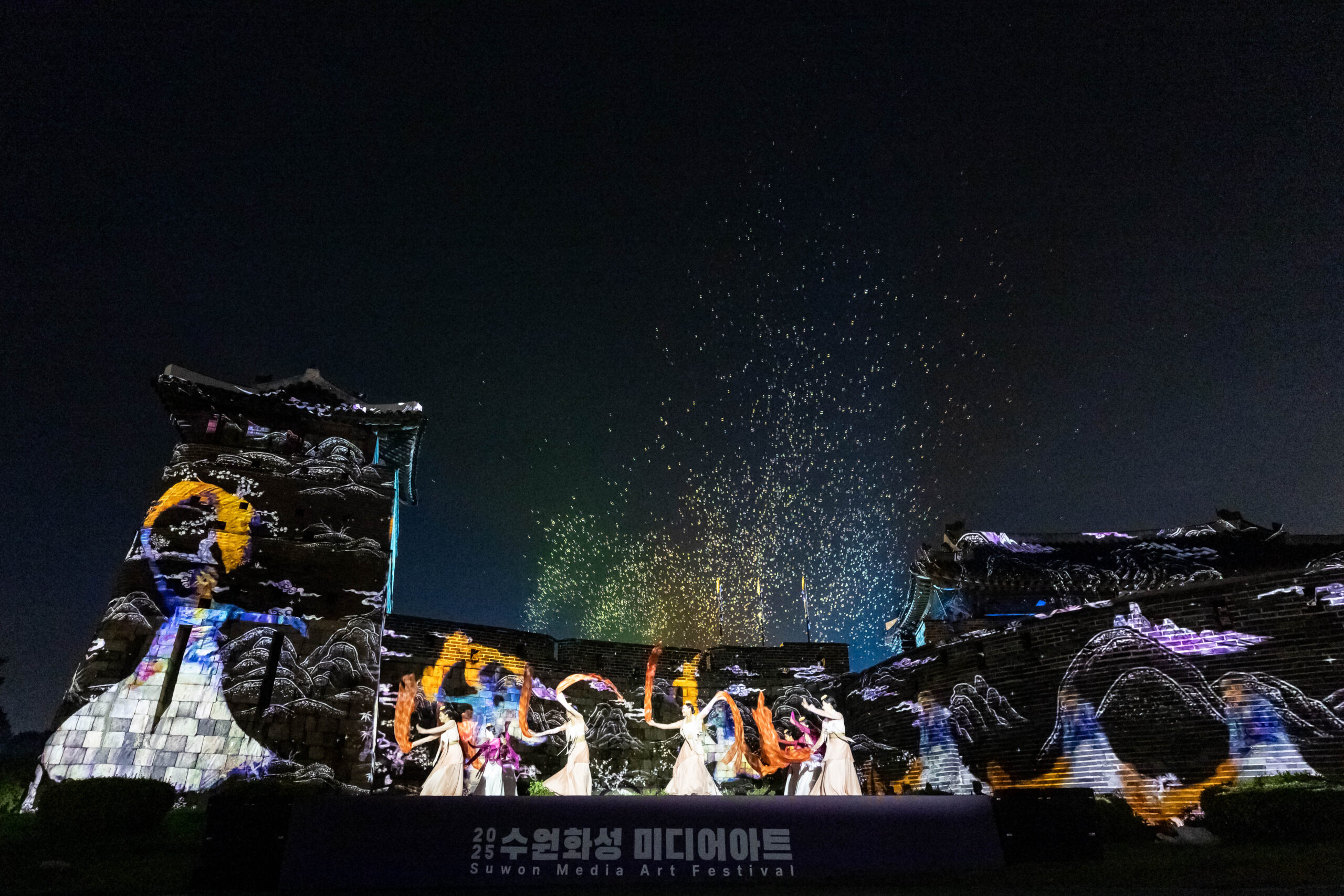 올해 역시 주무대는 ‘화서문’이다. 화서문 전체에 새빛 향연(배기태 등 5명) 작품이 매일 3회(오후 7시, 8시, 9시) 상영된다. 정조대왕의 을묘원행 이후부터 현재까지 수원의 역사문화적 발전상이 마치 한 편의 영화처럼 펼쳐지고, 전통과 현대가 예술로 공존하는 장면을 미디어파사드로 그려낸다. 각자의 색으로 빛나는 다채로움이 어우러져 ‘모두의 수원, 함께 빛나다’라는 메시지에 대한 공감대를 높이는 작품이다. 특히 오후 7시 상연에는 한국무용(춤판)과 발레(수원시티발레단)가 융복합한 퍼포먼스가 더해져 환상적인 예술세계를 선보인다.