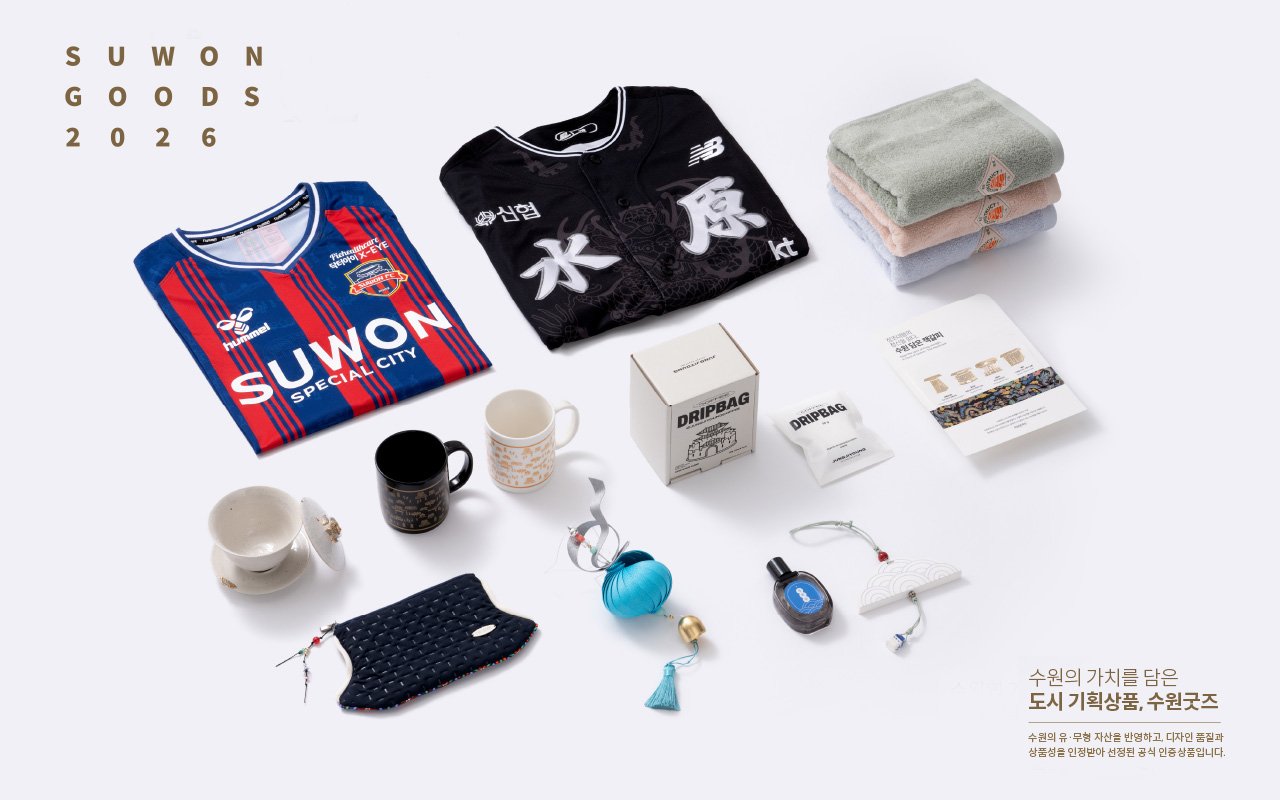 선정된 굿즈는 ▲수원담은 책갈피(이상공작소) ▲커피 드립백(정지영커피로스터즈) ▲효심깃든 복소라 풍경(봄날애공방) ▲수원화성을 담은 황금비율 아토얼 수건(아웃사이트) ▲점심다휴(도예공방공기) ▲수원화성을 담은 구름향기 모빌(스튜디오 수) ▲우리동네, 수원산책(양알마) ▲탐색 기와파우치(아트딜리버리) ▲정조대왕 유니폼(케이티스포츠 케이티위즈) ▲2026시즌 홈 유니폼(재단법인 수원FC)이다.